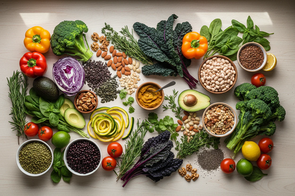 High in fiber from vegetables, legumes, and seeds